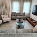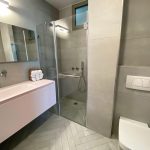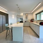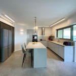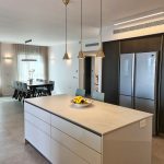 הריצוף שודרג לאריחים גדולים 120X120, החימום הישן הוחלף לחימום תת רצפתי, המטבח קיבל אי ושילוב לא שגרתי של דלתות זכוכית בגוון אפור מוחלש עם פורניר אלון. חדרי הרחצה לבשו אפור מסורק וחדר הרחצה של ההורים קיבל ארון כיור, קוריאן כולו, בוורוד עדין לא שגרתי.