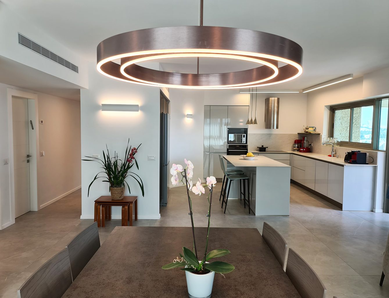 הריצוף שודרג לאריחים גדולים 120X120, החימום הישן הוחלף לחימום תת רצפתי, המטבח קיבל אי ושילוב לא שגרתי של דלתות זכוכית בגוון אפור מוחלש עם פורניר אלון. חדרי הרחצה לבשו אפור מסורק וחדר הרחצה של ההורים קיבל ארון כיור, קוריאן כולו, בוורוד עדין לא שגרתי.